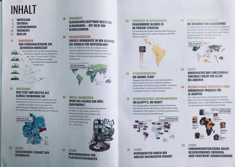 „Wie kommt man auf die vielen Ideen“, werden die MacherInnen des Magazin häufig gefragt. Manche Idee kommt von den Wissenschaftlerinnen, die für KATAPULT schreiben, andere kommen von den LeserInnen, wieder andere werden in der Redaktion gesammelt. Das Grundprinzip lautet: „Texte werden von WissenschaftlerInnen geschrieben und von der Redaktion visualisiert oder anders formuliert: Wissenschaftliche Studien werden in eine verständliche Sprache übersetzt.“