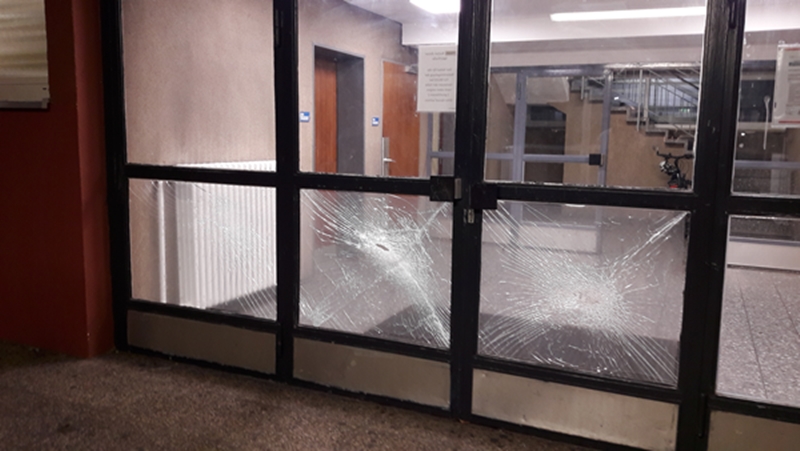Vandalismus an der Eingangstür einer Turnhalle in Mengede