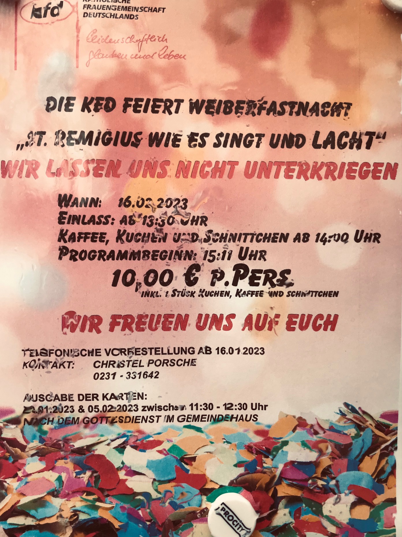Am 16.2.23 wird im Gemeindehaus der Kath. St. Remigiusgemeinde wieder Weiberfastnacht gefeiert. Einlass ist ab 13,30 Uhr, das Programm beginnt ab 15.11 Uhr.