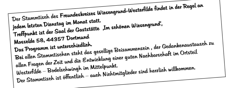 Der Freundeskreis Wiesengrund-Westerfilde lädt herzlich ein zum nächsten Stammtisch am