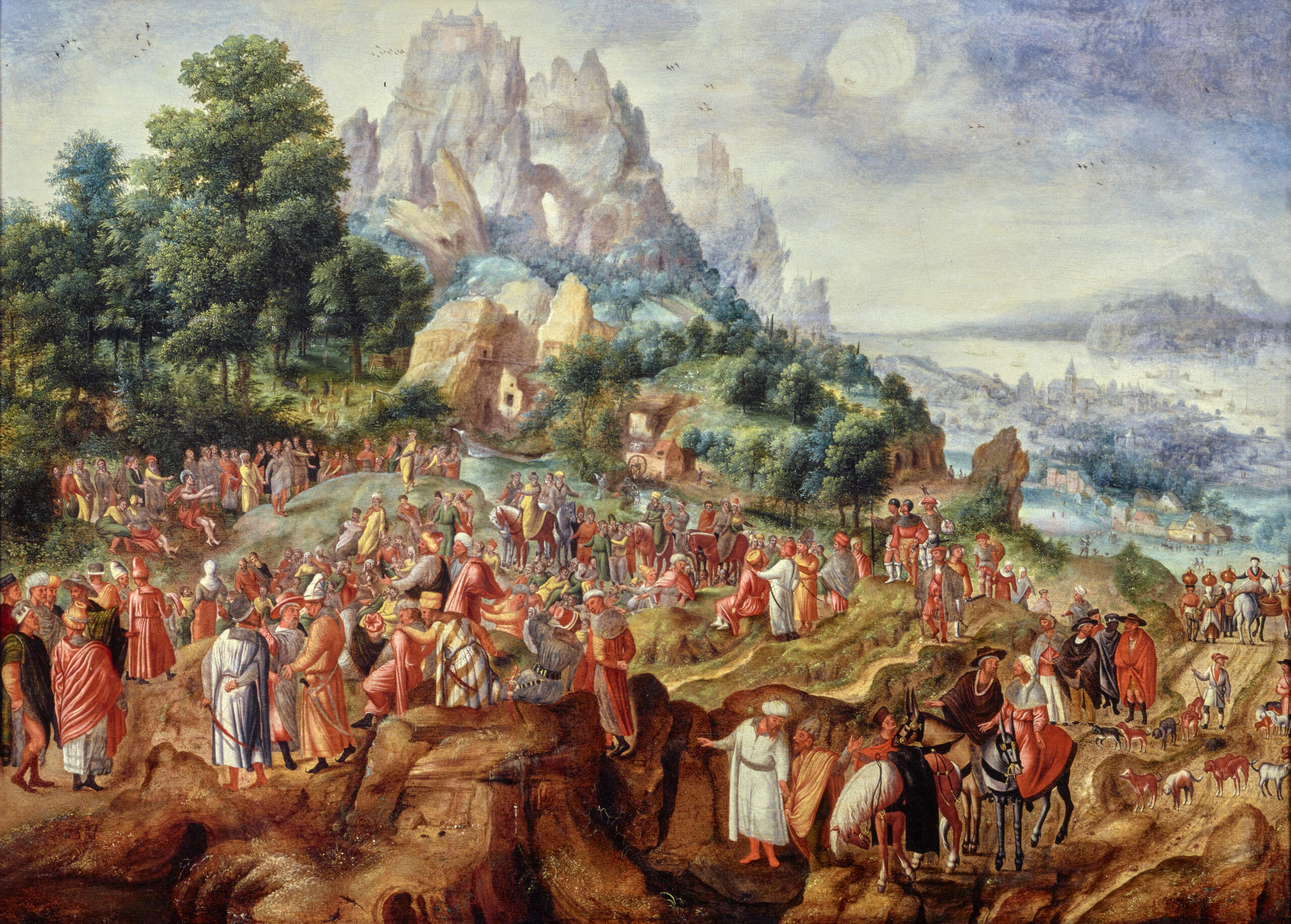 Folgt man dem Zug der Menschen, erblickt man eine Szene in der linken Bildhälfte: Dort sitzt ein Mann, der mit ausgestreckten Armen zu den Menschen spricht. Das Gewand aus Kamelhaar und der Heiligenschein geben ihn als christlichen Heiligen und Prediger Johannes der Täufer zu erkennen. Eine zweite, mit zarten Pinselstrichen angedeutete Szene in der Bildmitte verrät den Inhalt der Predigt: Dargestellt ist die Taufe Christi in einem Fluss, die begleitet wird von einem Engel und dem Heiligen Geist in Form einer Taube. Als Zeichen der Taufe erhält Christus von Johannes eine Handvoll Wasser über das Haupt gegossen. Dieser Vorgang kennzeichnet den in der Bibel beschriebenen Auftrag Jesu als Messias. Das göttliche Heilsversprechen ist Inhalt der Predigt des Täufers, die Met de Bles im Bild darstellt. Indem die biblische Szene in eine Weltlandschaft verlegt worden ist, wird die christliche Botschaft vermeintlich in die ganze Welt getragen.