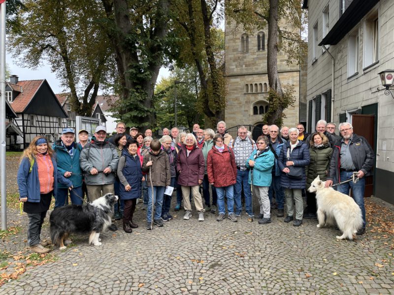 Der diesjährige Schnadegang, seit 2004 eine Traditionsveranstaltung des Heimatvereins Mengede, war auch in diesem Jahr wieder ein voller Erfolg. Es gab viel Lob für die Veranstalter, die sich zum Ziel gesetzt hatten, den Teilnehmenden die heimische Umgebung näher zu bringen, ihnen Informationen zu markanten Orten zu liefern und ganz nebenbei auch mit ein paar nicht ganz ernst zu nehmenden Grenzstreitigkeiten zu unterhalten. So hörte man im Lauf der fast 9 km langen Wanderung immer wieder die Aussagen: „Hier war ich ja noch nie“, „Hier war ich ja schon lange nicht mehr“ oder „Das habe ich noch gar nicht gewusst.“ Auch die Teilnehmerzahl spricht für sich. Fast 50 Schnadegängerinnen und Schnadegänger hatten sich am Tag der Deutschen Einheit (3.10.) am Heimathaus am Widum eingefunden, um an der Rundwanderung teilzunehmen. Bereits wenige Meter vom Start entfernt bekamen sie vom Heimatvereinsvorsitzende Hans-Ulrich Peuser Informationen über das ehemalige Haus Mengede, von dem nur noch einige Grundmauern als Bodendenkmal erhalten sind. Peuser wies dabei auch auf die jüngste Entwicklung hin, dass nämlich das Wasserschloss inzwischen durch die Zusammenarbeit von Heimatverein und Dr. Benjamin Weber quasi auferstanden ist virtuell erlebbar gemacht wurde.
