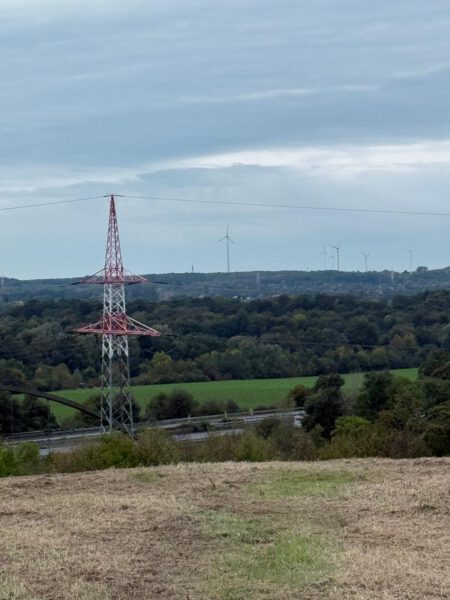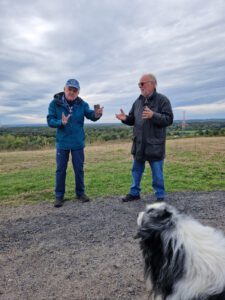 Weiter ging es über den Uferweg des Herrentheyer Baches zur Königsheide und danach auf die Halde Groppenbruch. Mit 94 m über N.N. ist sie die höchste Erhebung im Stadtbezirk Mengede. Hier gab es für die Teilnehmenden nicht nur genügend Platz zum Ausruhen auf den großen Steinblöcken, hier konnten sie auch einen weiten Blick in alle Himmelsrichtungen werfen. Zur Tradition gehört auch ein humorvolles Streitgespräch über den Grenzverlauf, das diesmal von Hans-Ulrich Peuser und Diethelm Textoris geführt wurde. Textoris vertrat die Lüner Interessen und behauptete, die Mengeder hätten in einer Nacht- und Nebelaktion die Grenzsteine versetzt, die natürliche Grenze sei der Kanal. Was von Peuser natürlich nicht unwidersprochen blieb. Nach weiteren Scheingefechten ohne Handgreiflichkeiten wurde schließlich ein Konsens gefunden und das Gespräch mit einem Handschlag beendet.
