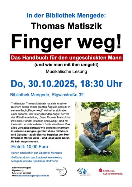 Am Donnerstagabend, 30. Oktober 2025, ist der charmante Thrillerautor Thomas Matiszik mit seinem Programm „Finger weg! – Das Handbuch für den ungeschickten Mann“ zu Gast in der Bibliothek Mengede.