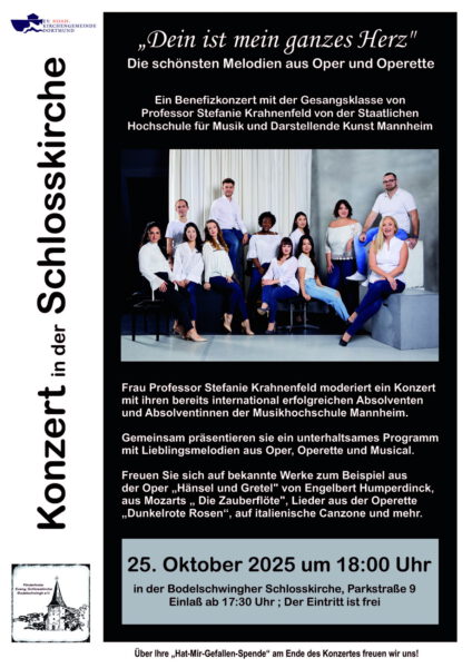 Das Benefizkonzert in der Schlosskirche wird moderiert von Frau Professor Stefanie Krahnenfeld von der Staatlichen Hochschule für Musik und Darstellende Kunst in Mannheim. Vortragende sind Studierende und Absolventen ihrer Gesangsklasse, die bereits international erfolgreich aufgetreten sind.Das unterhaltsame Programm enthält Stücke aus „Hänsel und Gretel“ von Engelbert Humperdinck, aus Mozarts „Die Zauberflöte, sowie Lieder aus der Operette „Dunkelrote Rosen, Italienische Canzoni und mehr.
