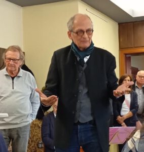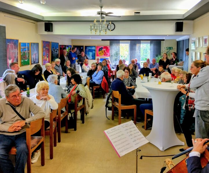 Mit dem Westerfilder Klümpken Nr. 5 konnte der Freundeskreis Wiesengrund-Westerfilde erneut einen großen Erfolg verbuchen: Die Eröffnung der Ausstellung ‚Druck und Pinsel‘ der Westerfilder Künstler Christel Deutschewitz und Max Maxelon zog zwar auch auswärtige Gäste an. In der Hauptsache aber interessierten sich sehr viele Menschen aus der Nachbarschaft im Quartier für die durchaus unterschiedlich gestalteten Werke der beiden Kunstschaffenden. Es waren so viele, dass nicht alle einen Sitzplatz fanden.Der Freundeskreis Wiesengrund-Westerfilde steuerte zur Vernissage selbstgebackenen Kuchen bei, so dass es zur Feier des Tages neben einem kleinen Sektempfang und Kaffee auch etwas zu Naschen gab. Max Maxelon, in seinem beruflichen Leben Musiker, empfing die Gäste mit drei kleinen Tangowerken – gespielt auf seinem Cello.