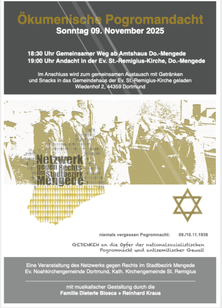 Am Sonntag, 9. November 2025, veranstaltet das „Netzwerk gegen Rechts“ im Stadtbezirk Mengede mit der Ev. Noah-Kirchengemeinde und der Kath. Kirchengemeinde St. Remigius eine Veranstaltung zum Gedenken an die Pogromnacht 1938.