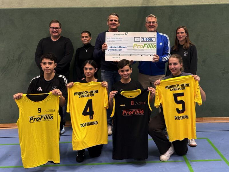 Große Freude herrschte am Freitag dem 14.11.2025 am Heinrich-Heine-Gymnasium (HHG) Dortmund: Die Schulgemeinschaft nahm neue Trikotsätze für die Schulmannschaften im Gegenwert von rund 5.300 Euro entgegen. Die Finanzierung erfolgte zum Großteil durch eine Spende der ProFiliis-Stiftung zur Förderung von Kindern und Jugendlichen in Höhe von 3.900 Euro, die Restsumme in Höhe von 1.400 € wurde durch den Förderverein des HHG zur Verfügung gestellt.