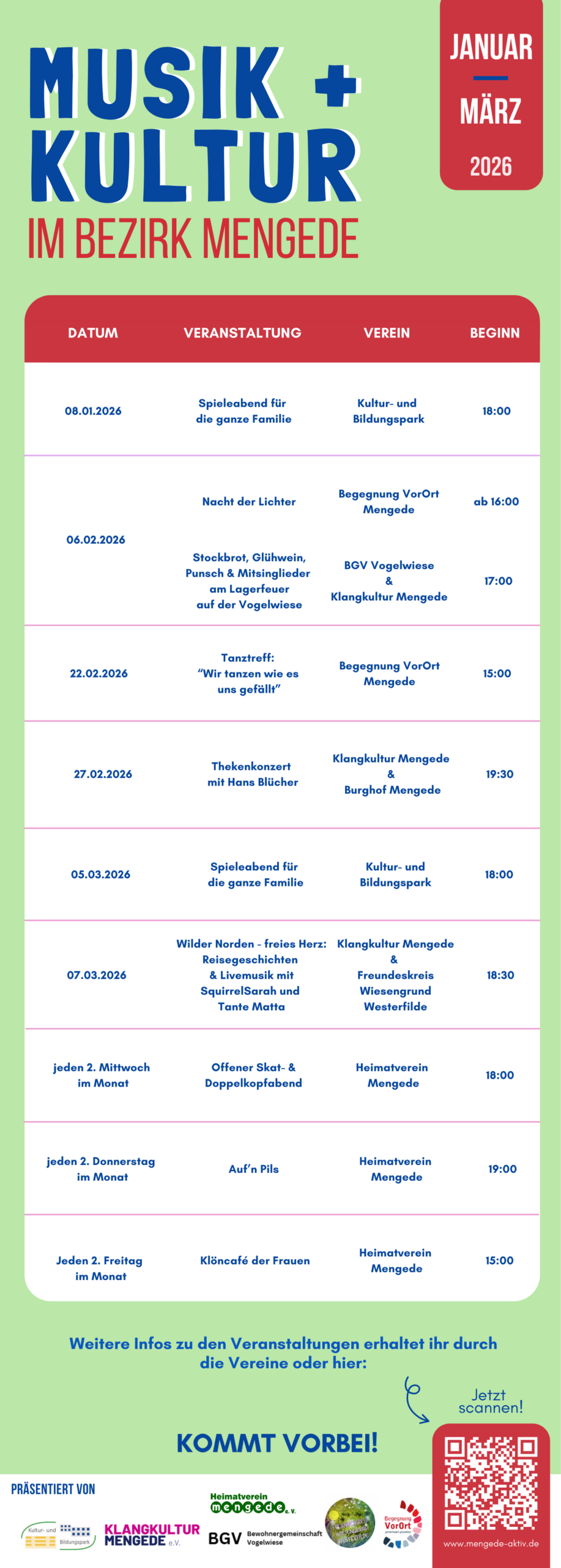 Julia Jockeck, Dirk Schulte (beide Klangkultur Mengede) und Lisa Jägermann (KuBiPa) haben das zweite Veranstaltungsplakat fertiggestellt; es ist gültig vom 01.01.2026 bis 31.03.2026.  fertig gestellt. Der Veranstaltungskalender bietet einen aktuellen Überblick über Termine und Aktionen im Stadtbezirk Mengede – für alle Generationen, oft kostenfrei und direkt vor Ort! Weitere Informationen sind über die Kulturvereine des Netzwerks www.mengde-aktiv.de oder über den QR-Code auf der Vorderseite des Plakates abrufbar.