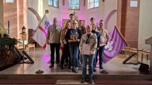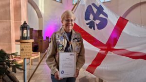 Eine besondere Ehrung gab es im Gottesdienst für Susi Talk. Sie habe auch „einen Funken Mut“ benötigt, als sie vor 25 Jahren trotz den Aufgaben in Familie und Beruf und völlig ohne Pfadfindererfahrung der Bitte gefolgt sei, Leiterin zu werden. Seitdem ist sie mit viel Herzblut im Mengeder Stamm aktiv und wurde nun vom Vorstand für ihr Engagement mit dem Georgs-Pin ausgezeichnet.