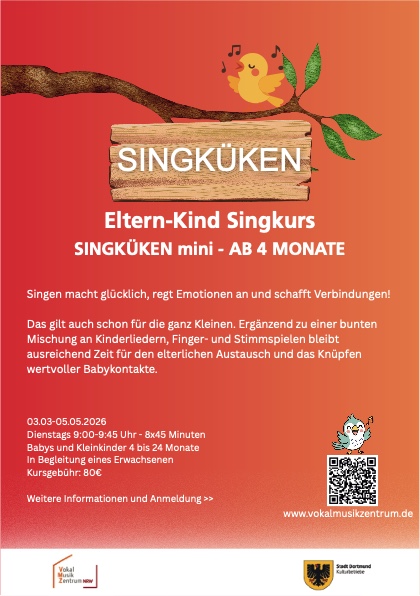Vom 03.03.2026 bis zum 05.05.2026 findet der Eltern-Kind Singkurs „Singküken mini – Ab 4 Monate“ wöchentlich im Vokalmusikzentrum NRW statt
