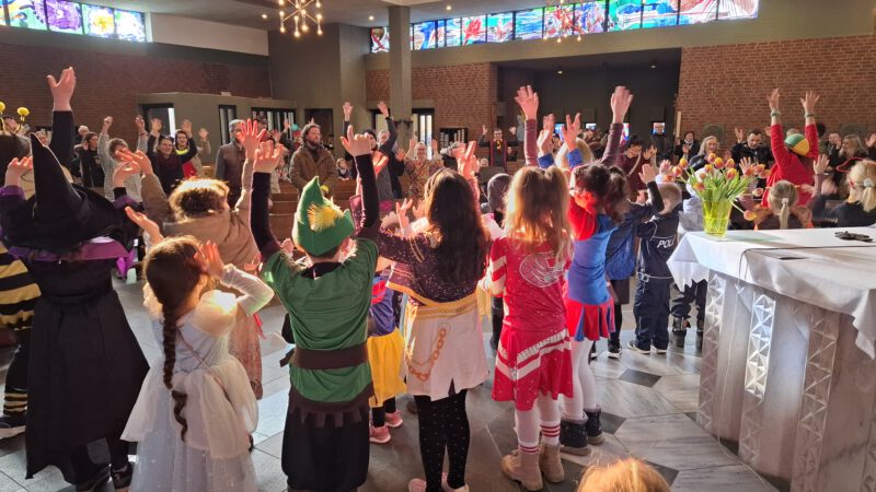 Einen stimmungsvollen Karnevalsgottesdienst feierten zahlreiche Kinder und Familien in Mariä Heimsuchung. Anschließend wurde im ausverkauften großen Saal des Gemeindezentrums mit viel Musik und Spielen kräftig Kinderkarneval gefeiert.Bunt kostümiert waren viele Kinder und Familien beim Karnevalsgottesdienst in Mariä Heimsuchung Bodelschwingh. „Wenn wir beten, dann erheben wir die Hände zum Himmel“, führte Gemeindereferent Markus Kohlenberg in den Gottesdienst ein – und stimmte mit der Gemeinde den passenden Karnevalshit an. Das sollte natürlich nicht der einzige Schlager bleiben und auch die Kinder des katholischen Kindergartens hatten zwei Bewegungslieder mitgebracht, welche die Versammelten in Schwung brachten. Anstelle der Predigt schlüpfte der Gemeindereferent indes in die Rolle eines Clowns und forderte mit einer gereimten Büttenpredigt auch die Reimkünste der Gottesdienstbesucher heraus.
