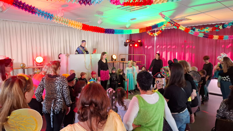 Schwungvoll ging es dann in den großen Saal des Gemeindezentrums, wo für die Familien in Kooperation mit dem Förderverein des Kindergartens eine Karnevalsparty organisiert war. Dort animierten DJ DenWo mit den besten Hits und Clown Markus mit der Gitarre die Kinder zum Tanzen und Mitsingen. Neben der ein oder anderen Polonaise gab es zwischendurch auch kleine Spiele, die den Kindern und Erwachsenen viel Spaß machten. So wurde bis in den Nachmittag hinein noch kräftig Karneval gefeiert.